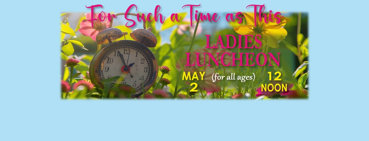 Bring your mothers, your daughters, your in-laws and your friends. We'll have a sweet time of fellowship as we gather for lunch and to learn how God has created us "For Such a Time as This".